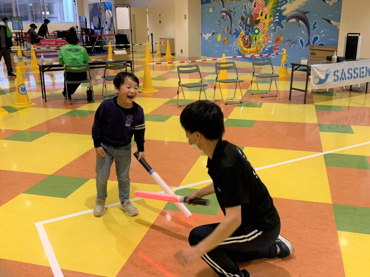 体験会では、いきなり試合というわけではなく、まずは練習刀を使ってウォーミングアップ。「相手の足に2回ヒットさせたら勝ち」「相手の体に2回ヒットさせたら勝ち」「5スイングの中で相手の体に2回ヒットさせたら勝ち」(ただし頭部への攻撃はNG)と少しずつルールを加えながら、段階を踏んで体を温めていきました。