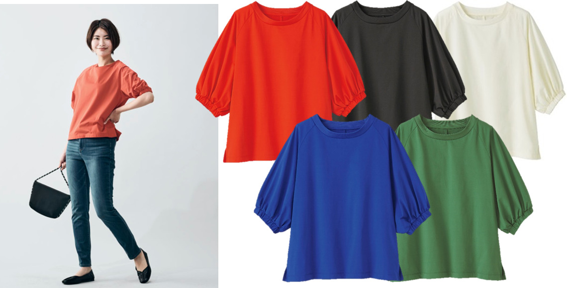 「DRYサイドポケットパフスリーブTシャツ」は、パフスリーブでオシャレに着回せる1着。カラー展開はブラック、オートミール、レッド、グリーン、ブルーの5色から選べます。