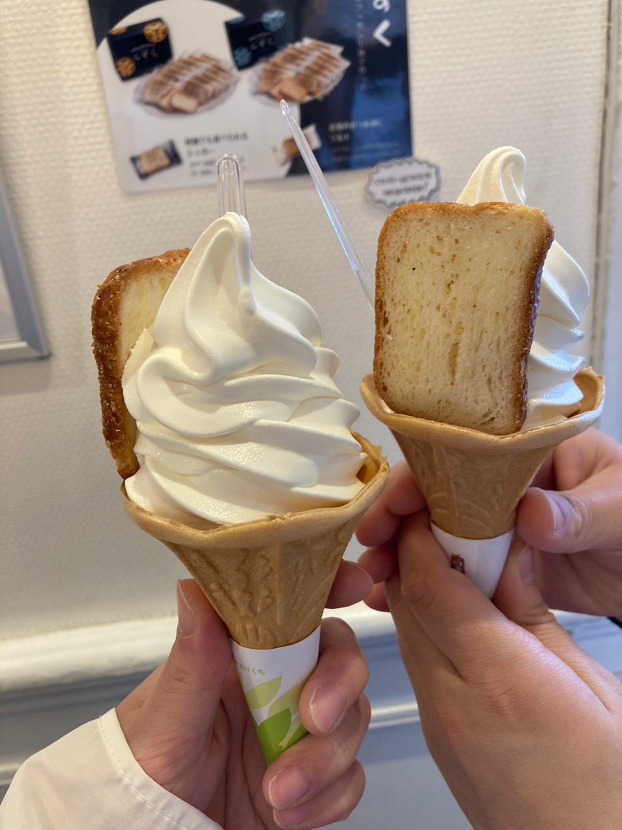 クロワッサンラスクが添えられたソフトクリームをテイクアウトし、潮風を感じながら楽しみました。