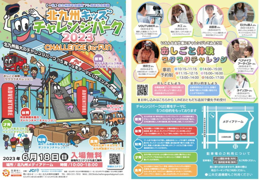 6月18日午前10時~午後6時、「北九州メディアドーム」(北九州市小倉北区三萩野3-1-1)で、「北九州キッズチャレンジパーク2023〜Challenge for Fun!〜」が開催されます。