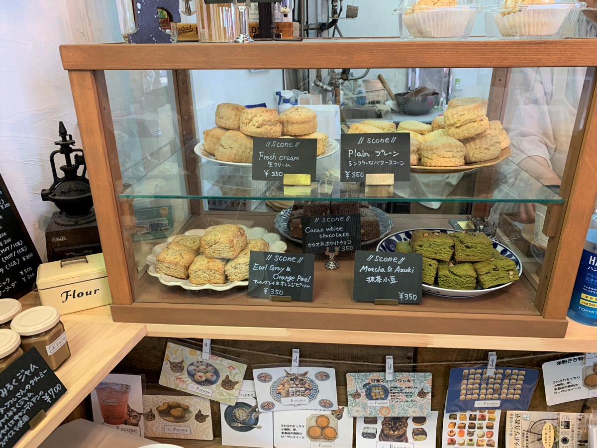 訪問日は、ショーケースの上段に「生クリームスコーン」「プレーンスコーン」、下段に「アールグレイとオレンジピールのスコーン」「抹茶と小豆のスコーン」「カカオとホワイトチョコのスコーン」と、5種類のスコーンがお皿の上に行儀よく積み重なっていました。