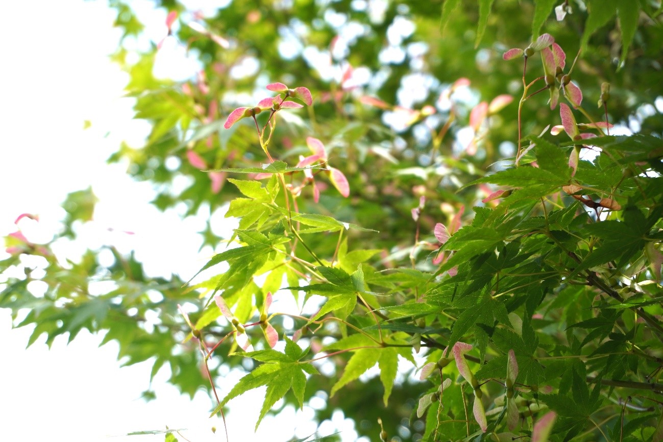 かわいいヘリコプターの回転翼みたいな形をした花はやがて実が膨らんできて秋には翼果を使って遠くに種を飛ばします。