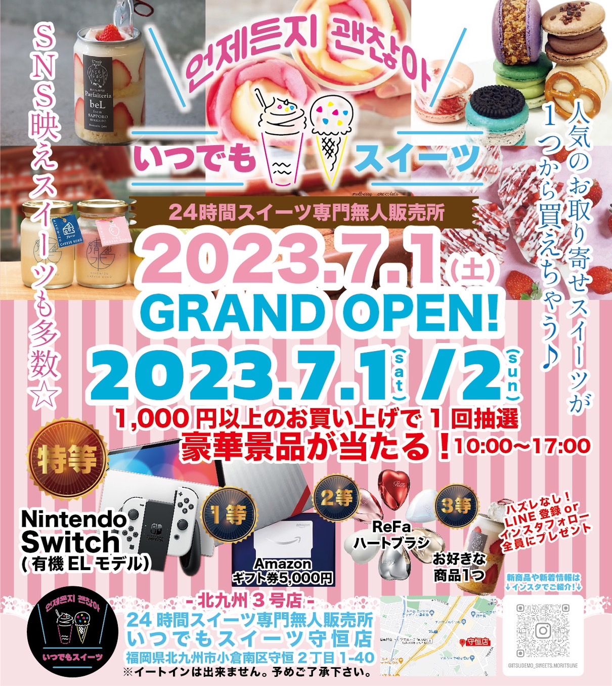 折尾・魚町に続き、小倉南区守恒に初のフランチャイズ1号店となる「いつでもスイーツ小倉守恒店」が7月1日にオープンします。