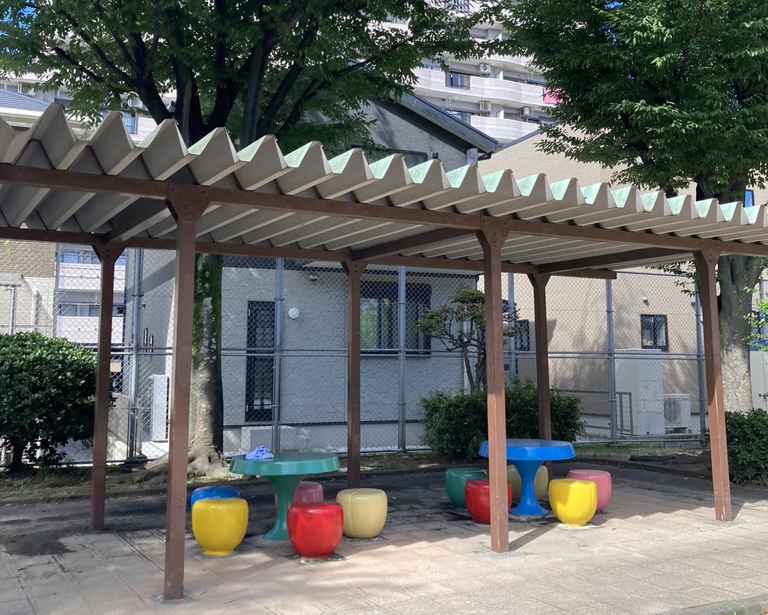 公園に入ってすぐ左手にある、こちらの休憩場所。カラフルな椅子と机が目を引きます。