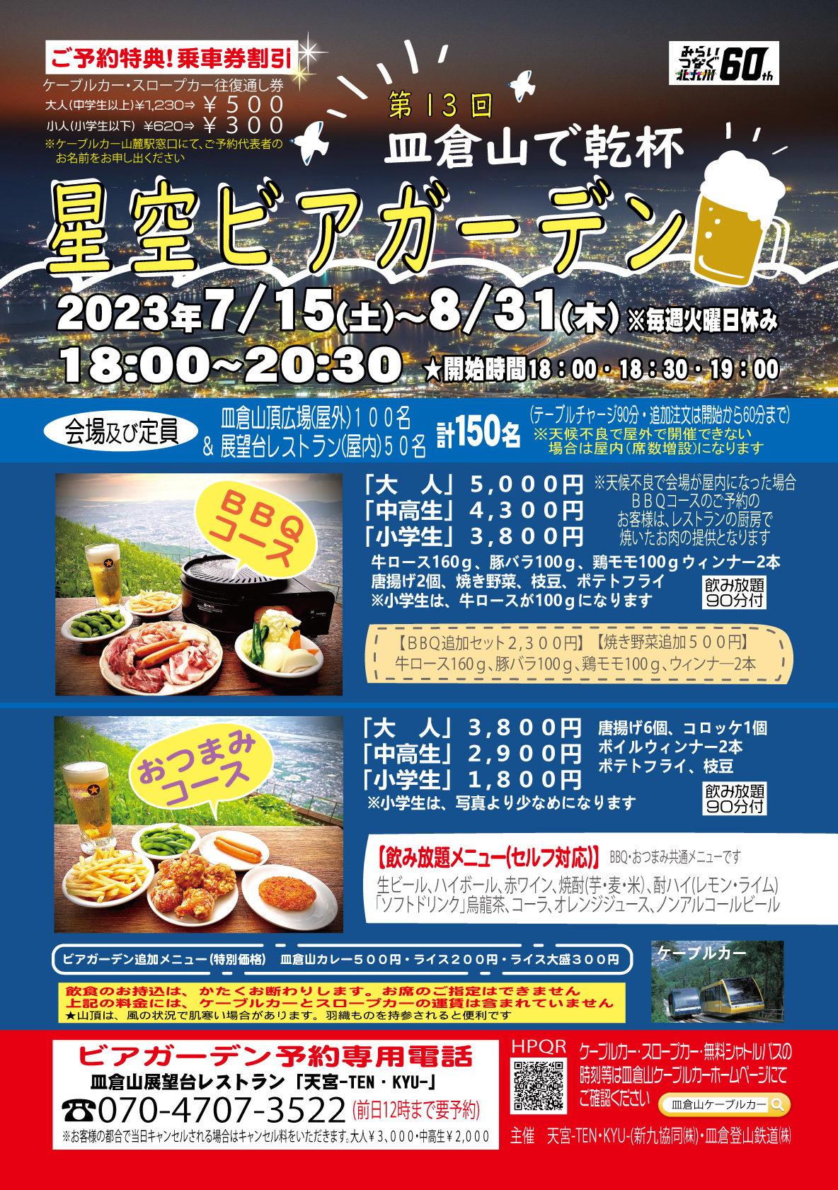 「皿倉山頂で乾杯!星空ビアガーデン 2023」7月15日スタート/皿倉山ケーブルカー