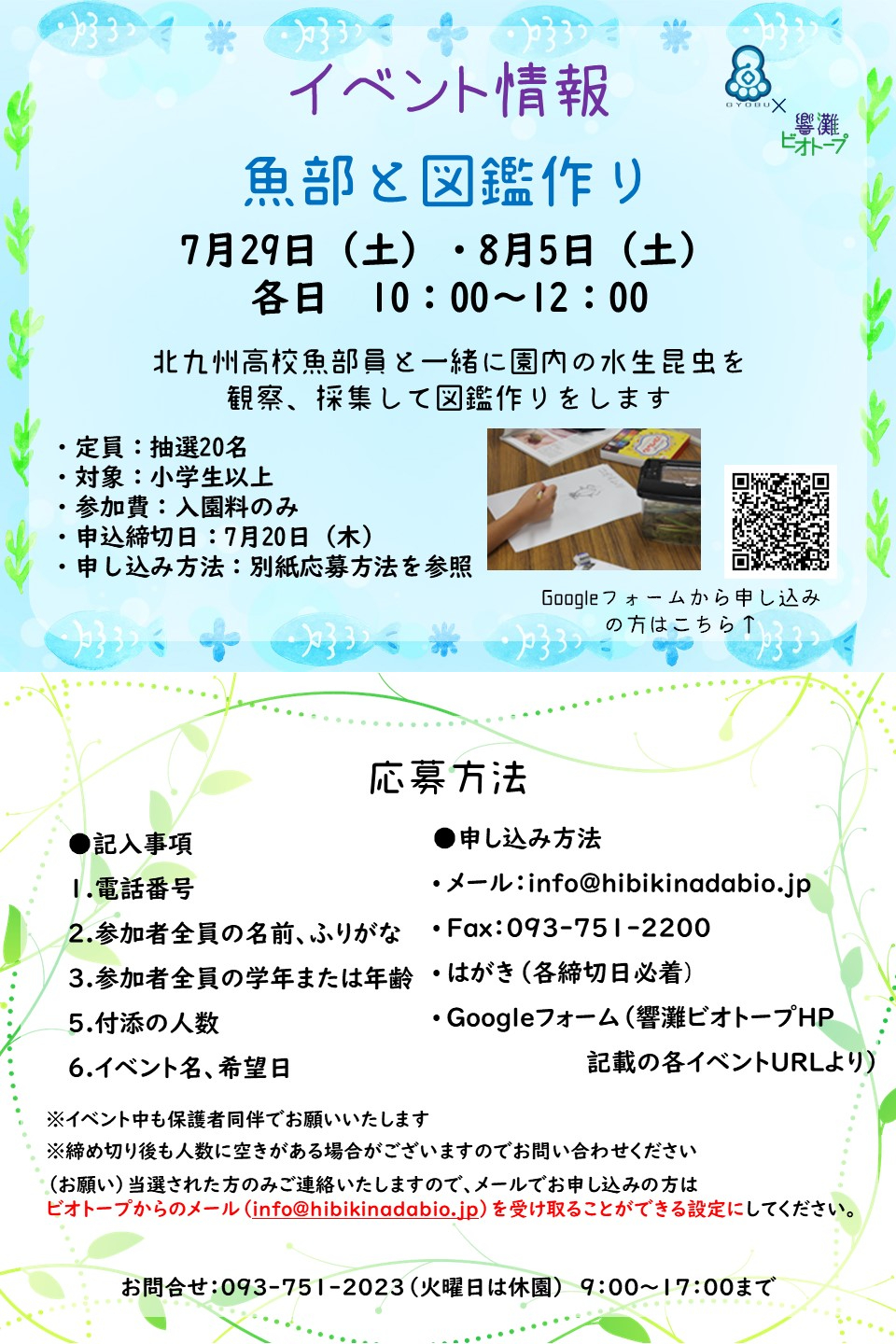夏のイベント第2弾「魚部と図鑑作り」の参加者を募集中です。北九州高校の魚部と一緒にメダカやゲンゴロウの仲間など園内の池にすむ生き物たちを採集してオリジナルの図鑑を作ろう! 応募方法や詳しい内容については画像または響灘ビオトープHPをご確認ください。