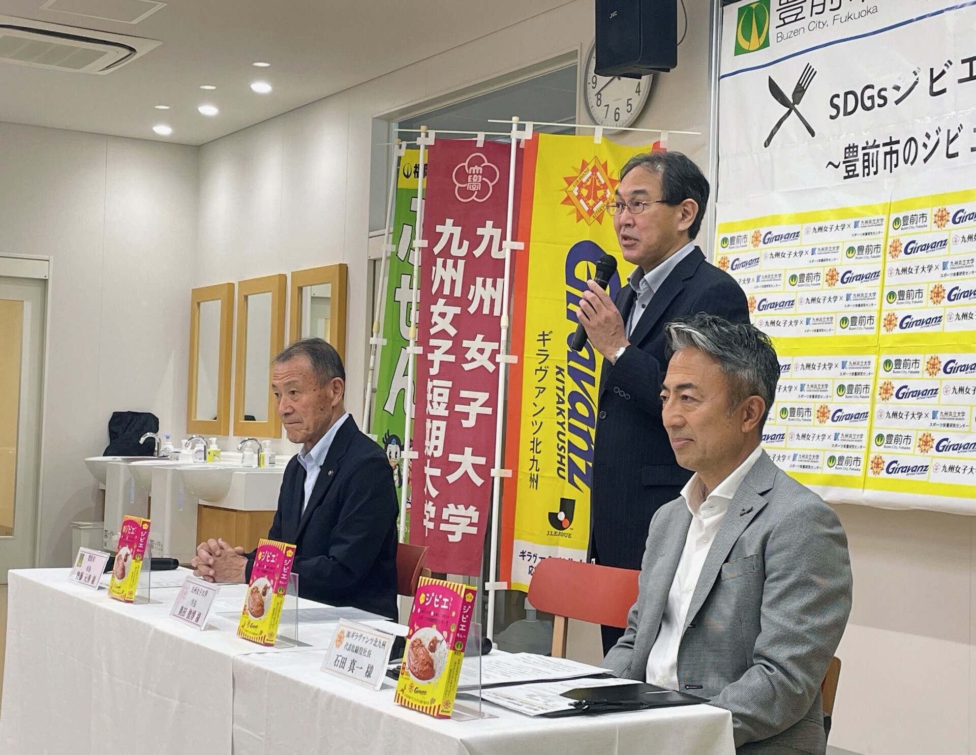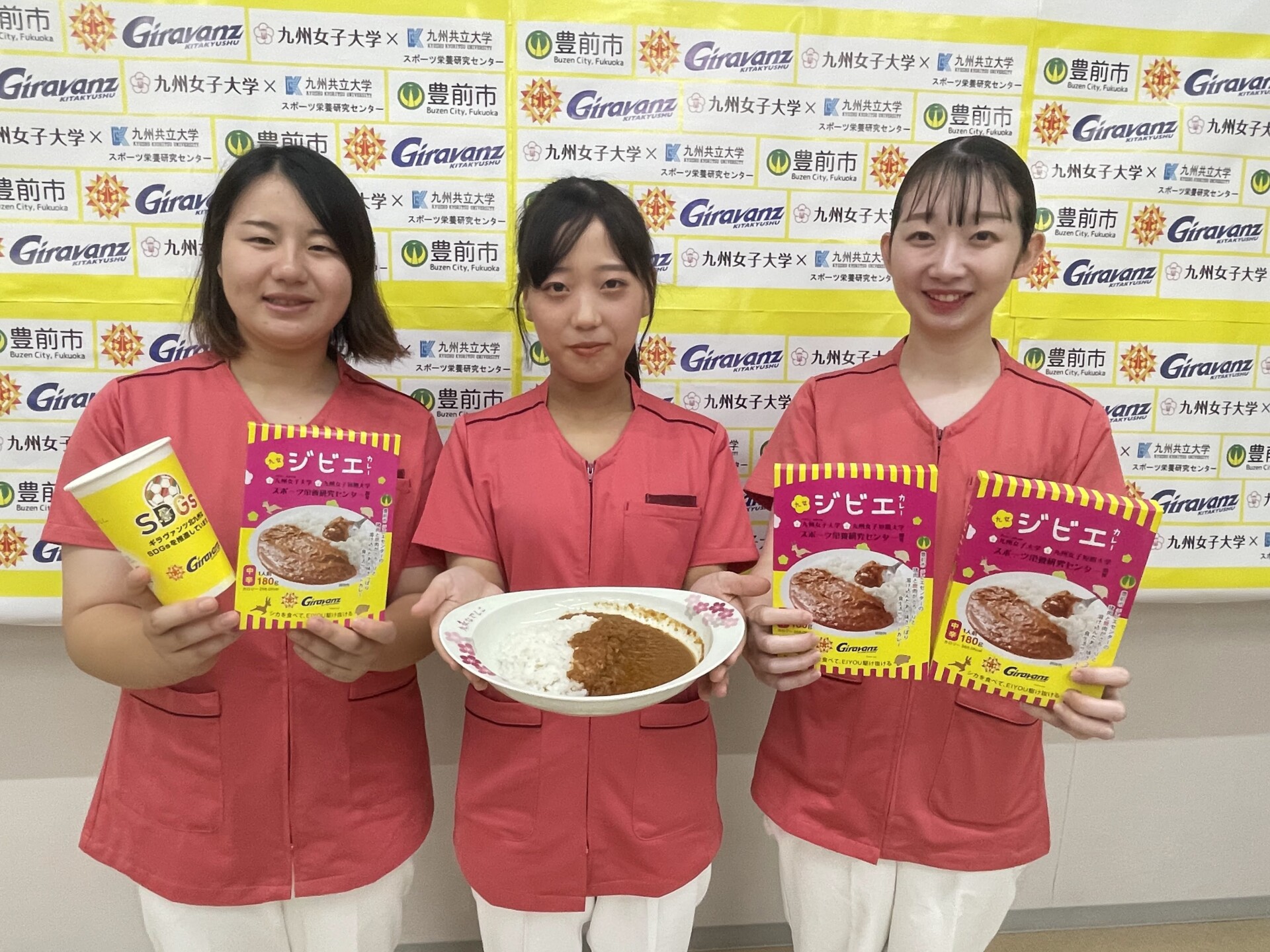 九州女子大学×ギラヴァンツ北九州×豊前市の共同プロジェクト「SDGsジビエカレー開発」。⿃獣被害に悩む豊前市の課題解決とともに、ギラヴァンツ北九州の栄養指導に取り組んでいる九州⼥⼦⼤学栄養学科の学⽣の学びの場の創出を兼ねたSDGsプロジェクトです。
