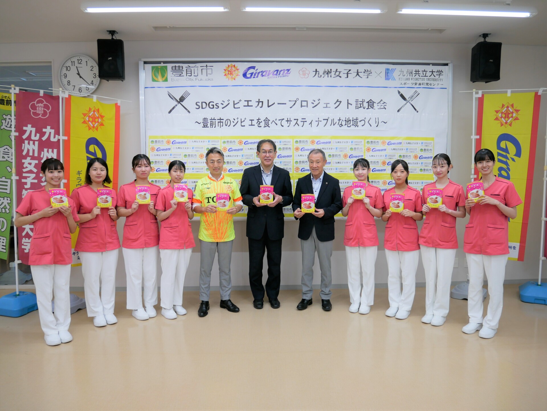 7月12日に九州女子大学で開催された「SDGsジビエカレー開発キックオフイベント」には、カレーを開発した九州女子大学家政学部栄養学科4年の巴ゼミ・山本ゼミの学生をはじめ、豊前市の後藤元秀市長、九州女子大学の奥田俊博学長、ギラヴァンツ北九州の石田真⼀代表取締役社⻑らが出席。カレーの試食会も行われました。