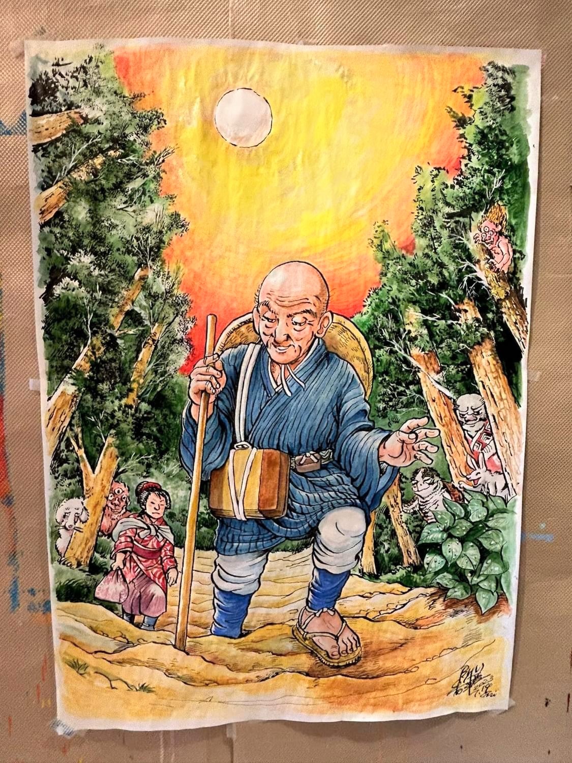 これは、葛飾北斎と、娘お栄さんが、温泉に行く途中のイラストとのこと。