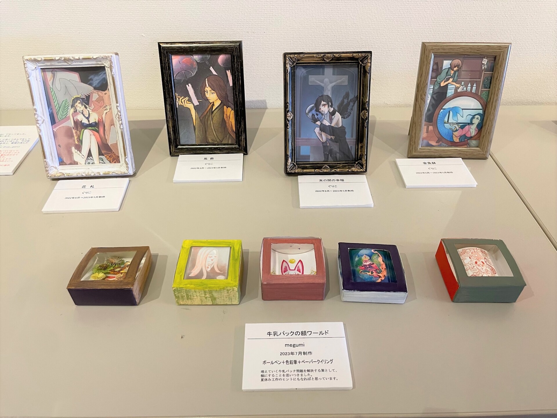 上の写真に写っている手前の作品は、イラストを牛乳パックの額に入れたもので、夏休みの宿題にも良さそうです。