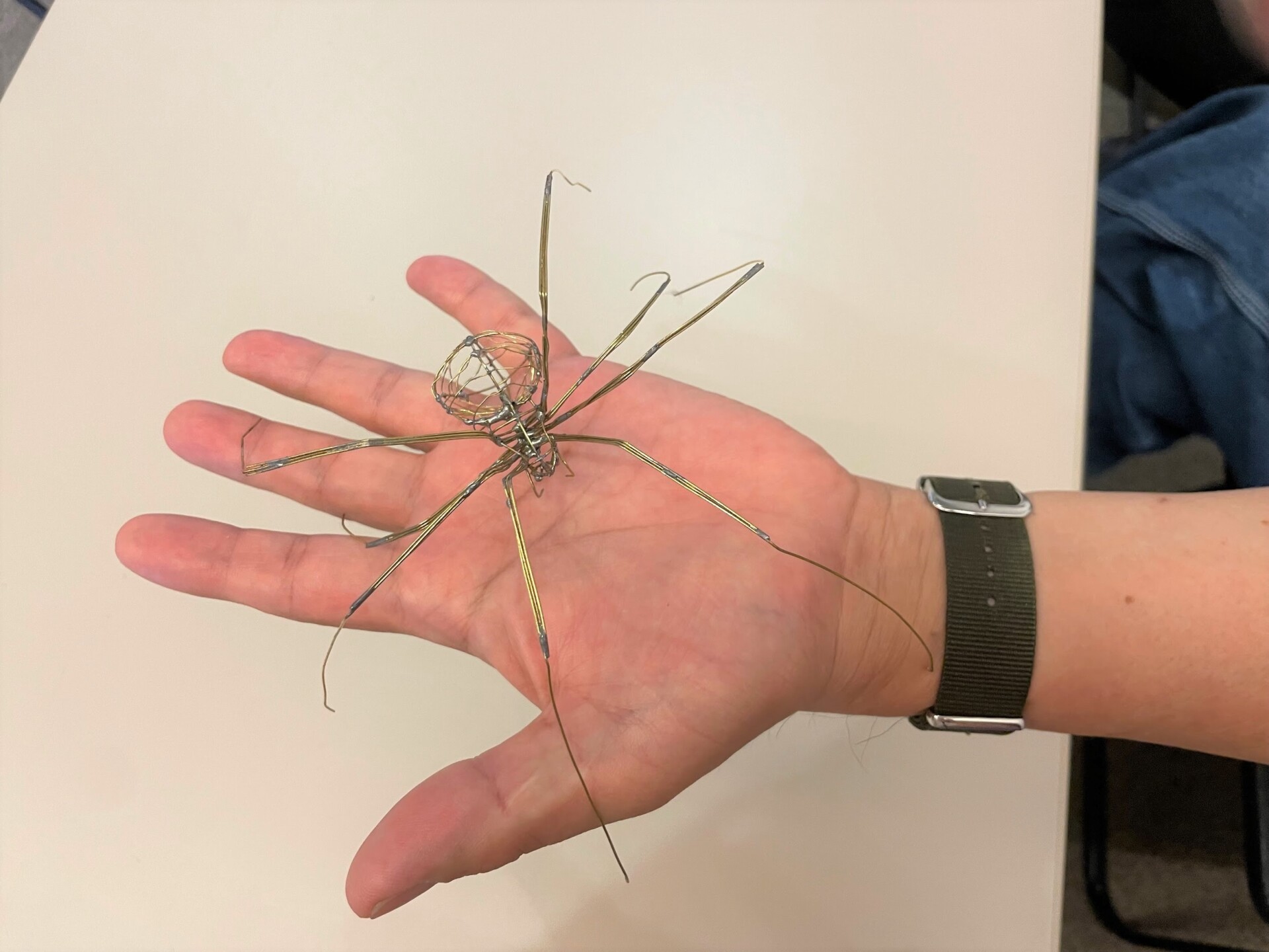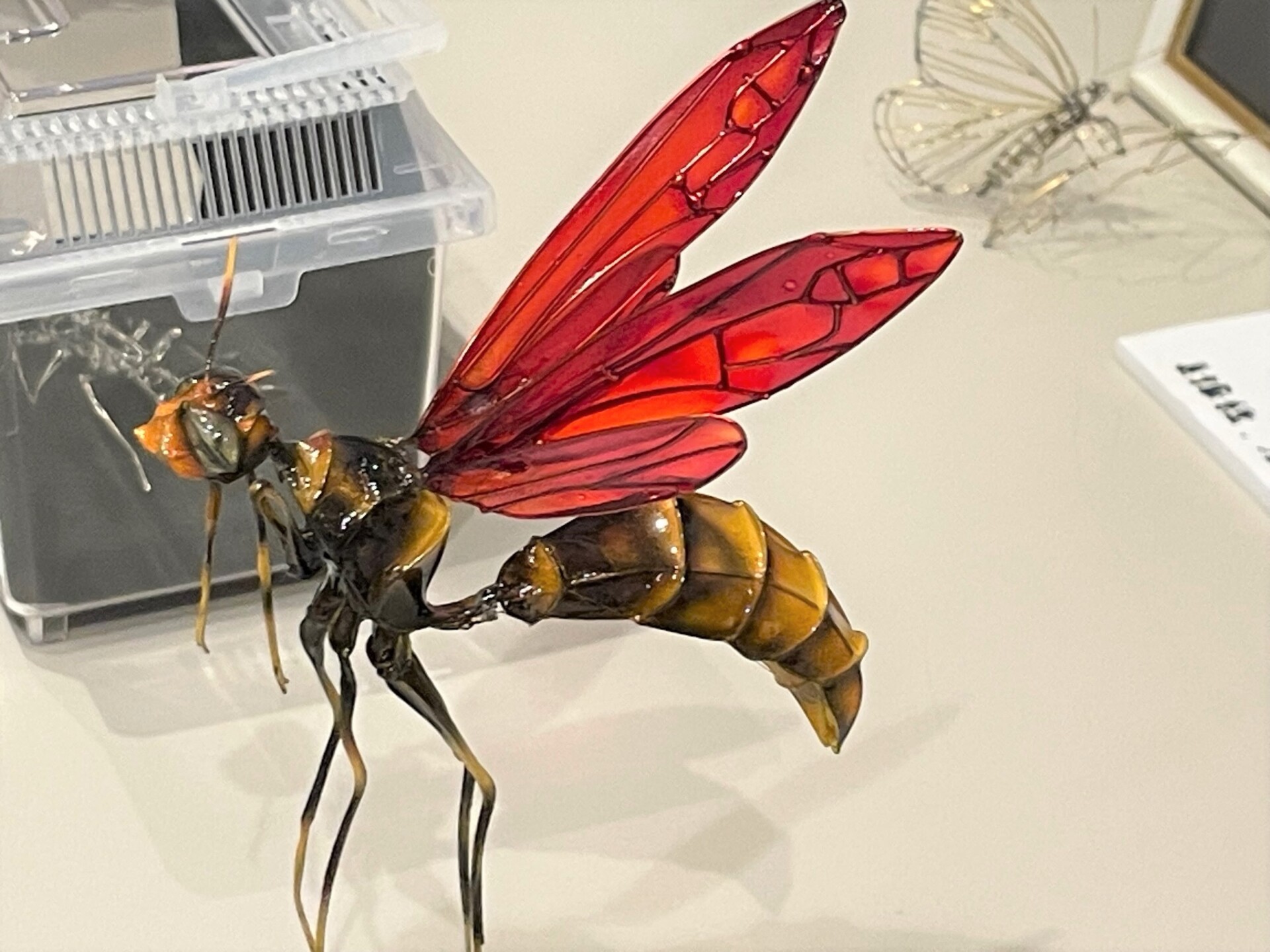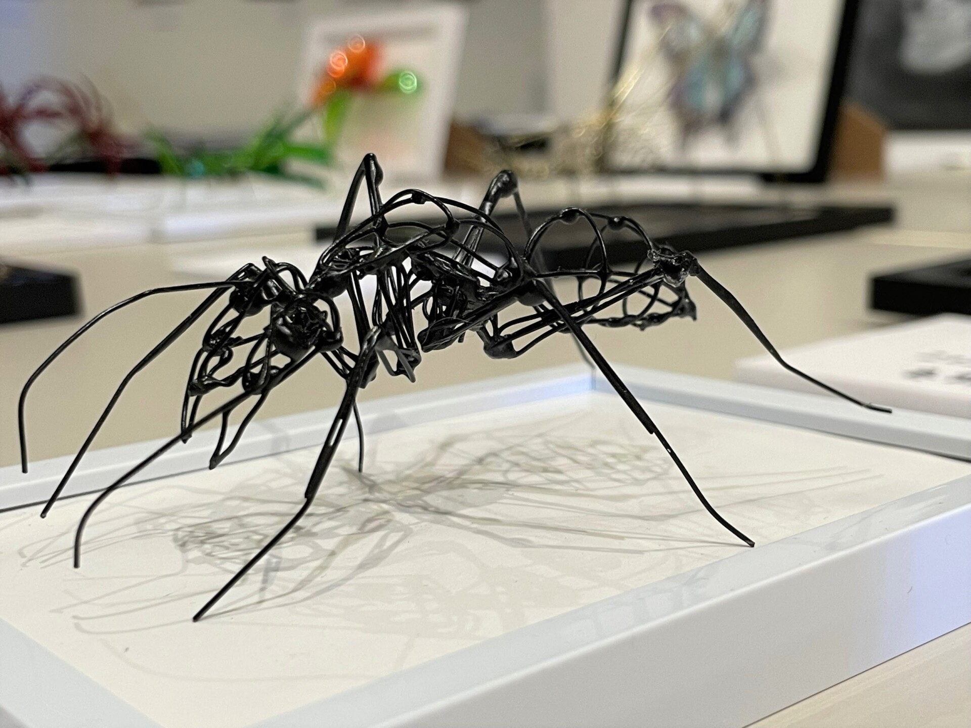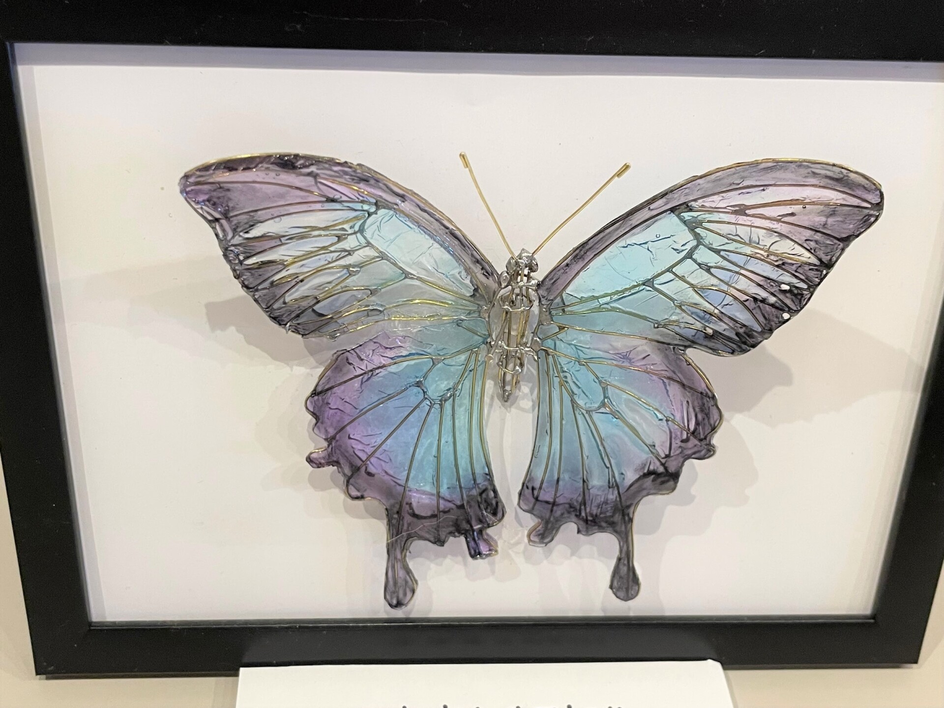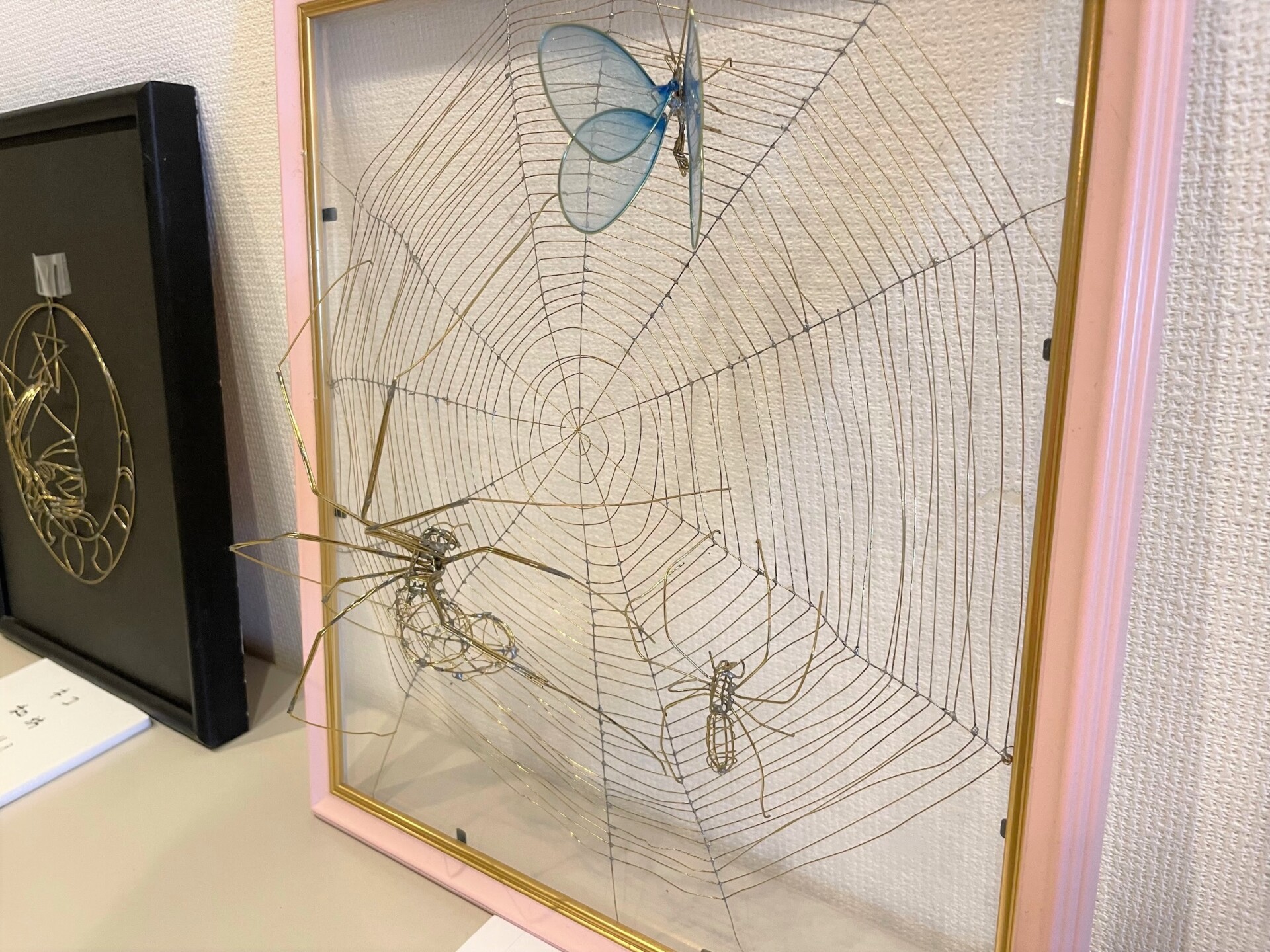 7メートルのワイヤーで作られた蜘蛛の巣にかかった蝶の作品には、見入ってしまいました。