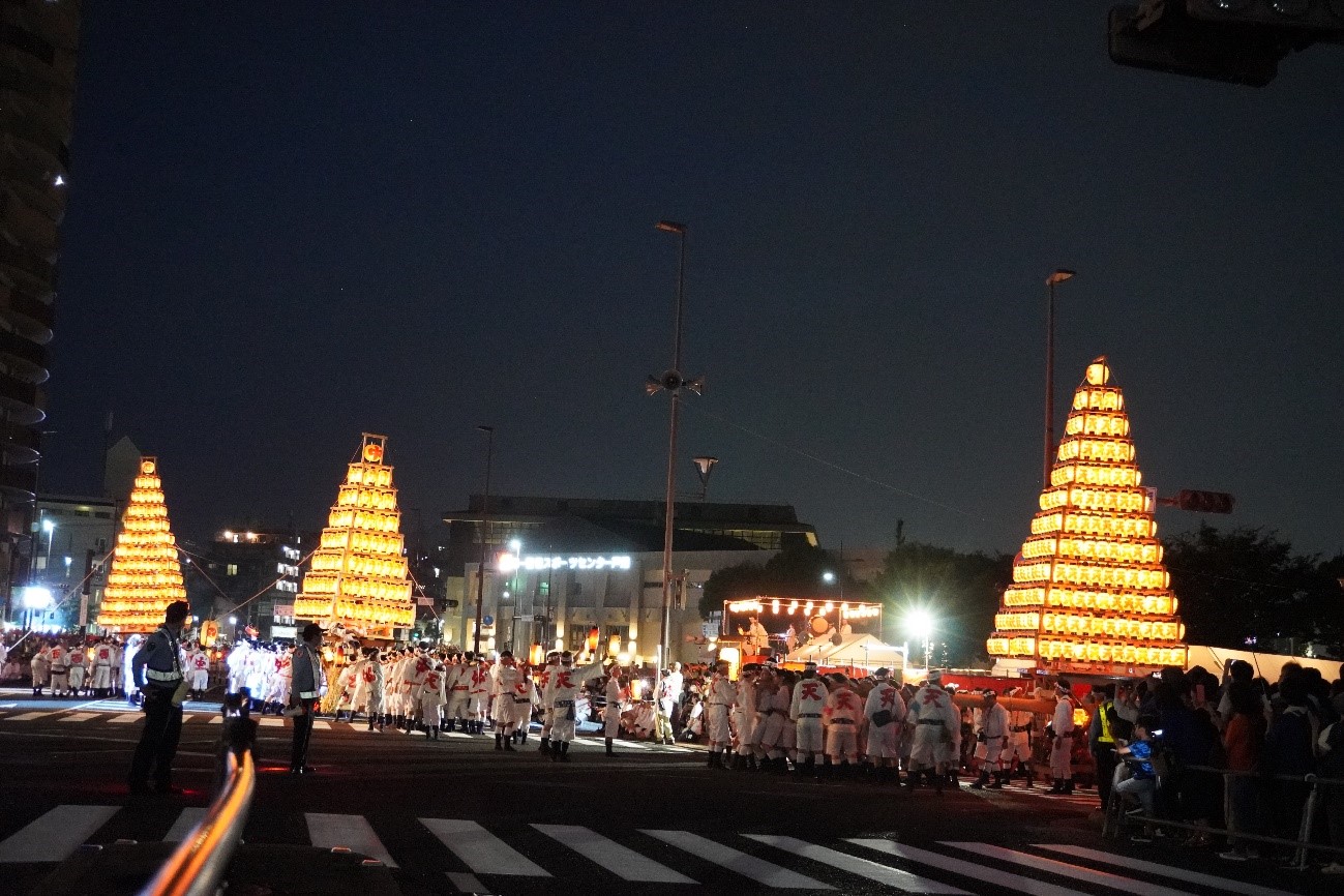 神事の終了後、町内を廻りながら競演会場である浅生通りに戻った山笠は昼の幟山笠の装いから光のピラミッドに装いを変え、「おおたろう囃子」という戸畑祇園独特のお囃子と「ヨイトサ」の掛け声で大勢の観客の喝さいを浴びていました。