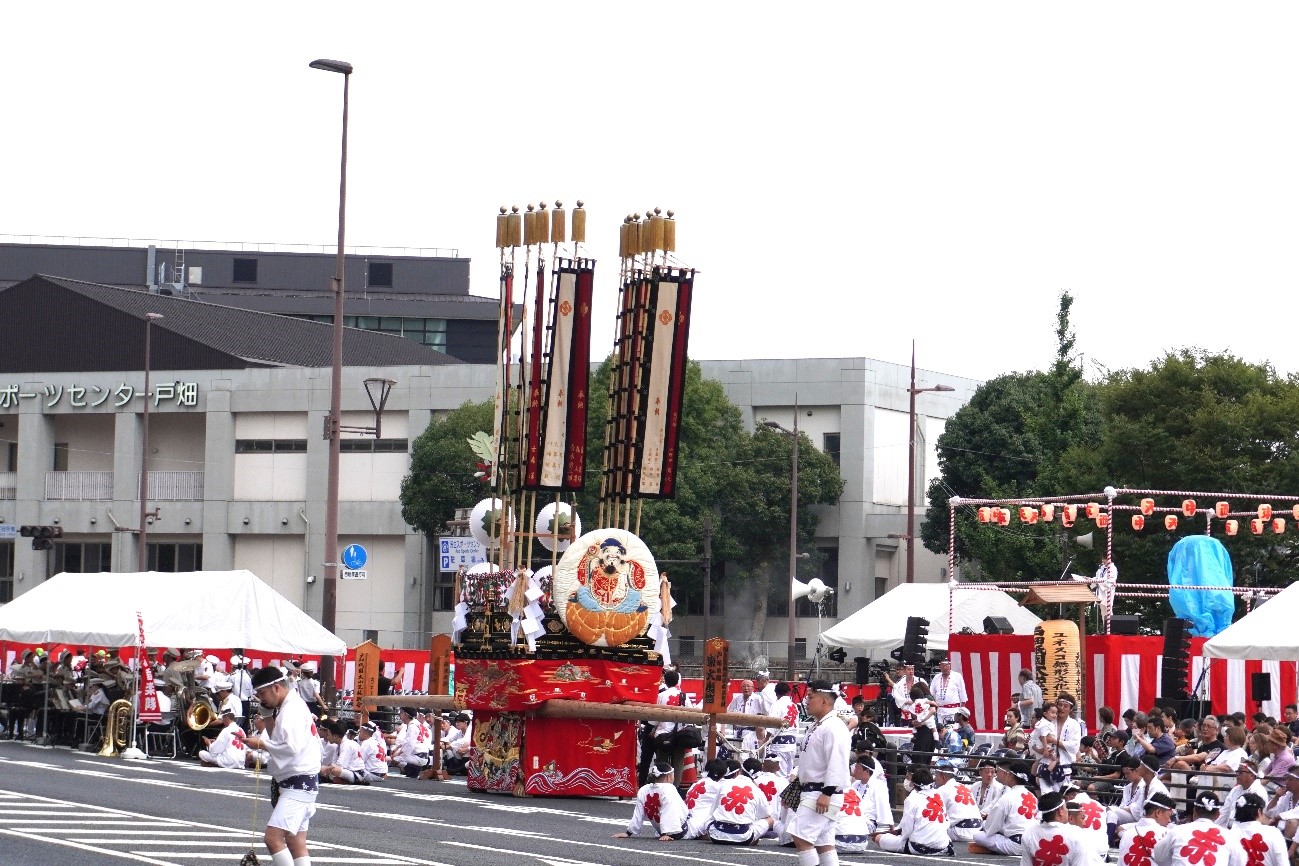 当番山である東大山笠が神主さんを載せて昼の幟山笠の姿でやってきた