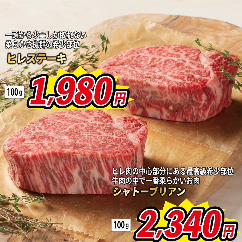 鹿児島黒牛を一頭丸ごと取り扱う、牛肉のふくながだからできる厳選されたヒレステーキや、ヒレの中でも最も柔らかいシャトーブリアンがこの価格! 最高級部位でも百貨店や通販に比べてお得に購入できる牛肉のふくながにぜひご来店下さい。
