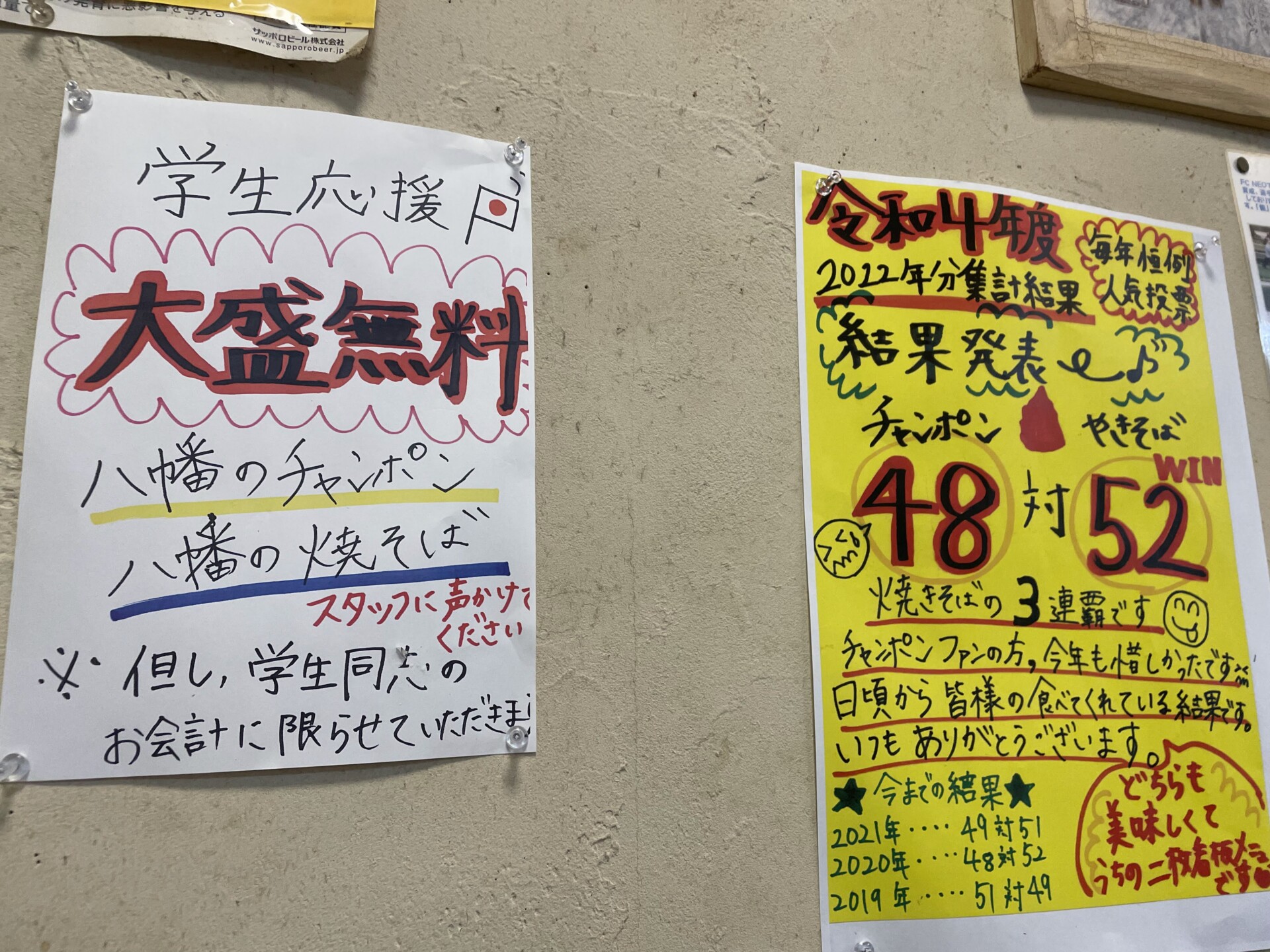 同店の二大看板メニューである「チャンポン」と「焼きそば」の人気投票結果が貼り出されていました。毎年恒例らしく、令和4年度の集計結果は僅差で焼きそばの勝利。