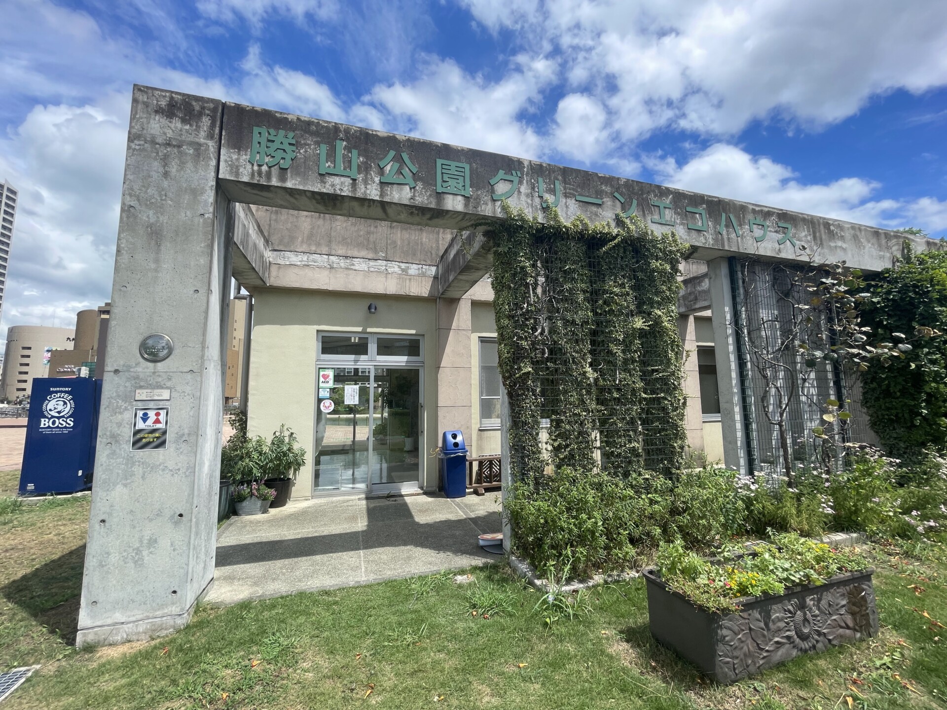 大芝生公園の南側にある「勝山公園グリーンエコハウス(公園管理事務所)」は、太陽光発電・LED照明・屋上緑化・緑のカーテンに加え、断熱効果の高い壁や窓を採用するなど低炭素社会に配慮した建物。誰でも利用できる休憩所になっており、アルコールを除く飲食に利用できます(各自ごみは持ち帰り)。また「北九州市赤ちゃんの駅」にも登録され、授乳やおむつ替えができるスペースもあります。利用時間は午前9時〜午後5時。