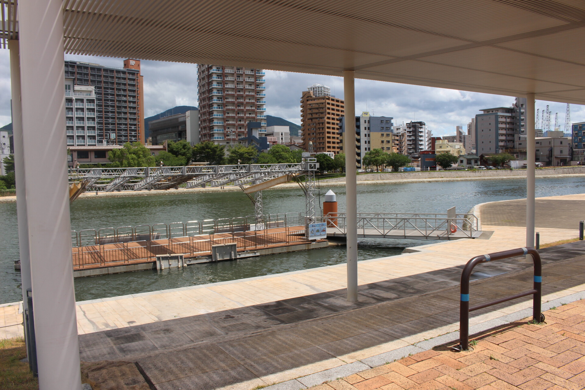 2006年に大芝生広場とともに整備された「水上ステージ」は、音楽やダンスイベントなどで活用されています。観覧席にもなっている大階段は屋根つきで日陰になっているので、ここで紫川を眺めるのもいいですね。
