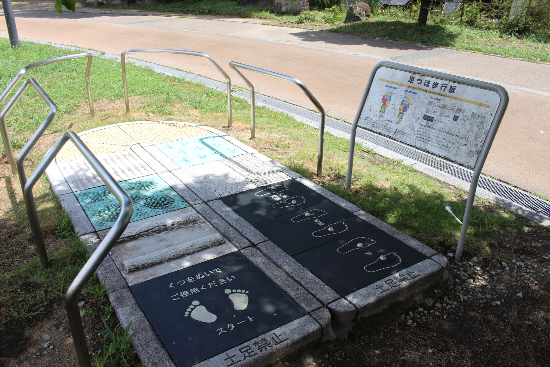 近くには足つぼ歩行板もありました。胃や腎臓、心臓や肝臓など各部位に対応する足つぼがあるので、気になる人は乗ってみるのもいいですね。周辺には足に優しいウォーキングコースもあり、健康づくりにぴったりです。