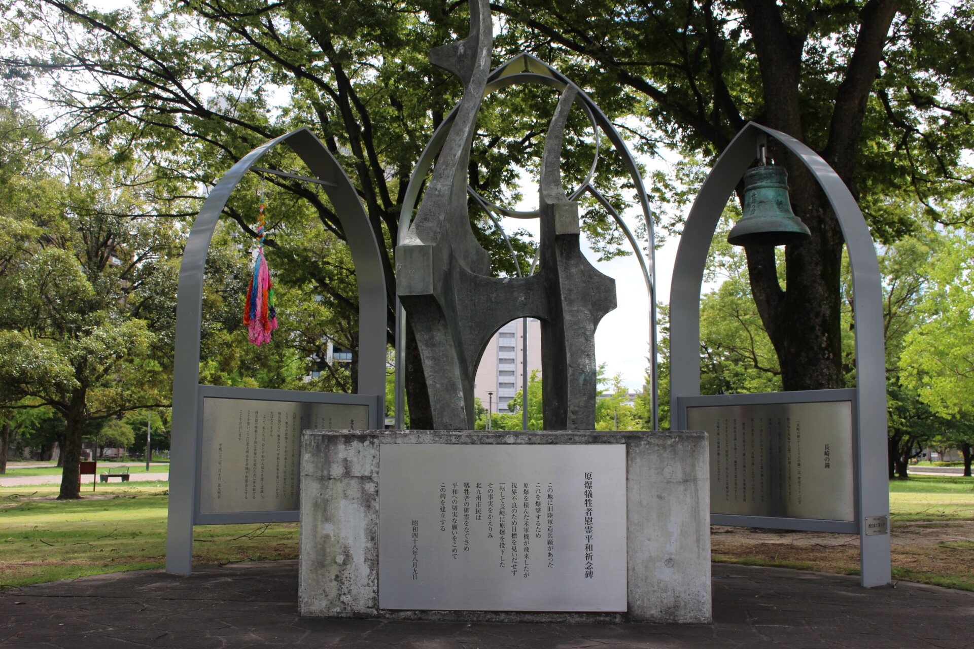 広場の中央にあるのは「原爆犠牲者慰霊平和記念碑」。勝山公園には軍需品を開発・製造する兵器工廠が置かれており、1945(昭和20年)アメリカ軍による原爆投下の候補地として小倉も含まれていました。しかし8月9日、原爆は第1目標の小倉ではなく長崎市に投下。北九州市民は被曝者の霊を慰め、平和を祈るためこの慰霊碑を建立したそう。隣にあるのは、長崎市から贈呈された「長崎の鐘」。毎年8月9日の長崎原爆の日には慰霊祭が行われています。