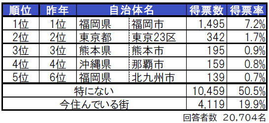 九州・沖縄の居住者を対象に調査を行った住みたい街(自治体)ランキングのトップは、4年連続で「福岡県福岡市」。