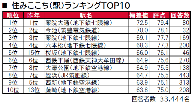 住みここち(駅)ランキングのトップは、地下鉄七隈線の「薬院大通駅」。北九州市からは八幡西区の「今池駅」が昨年同様の第2位にランクインしました。