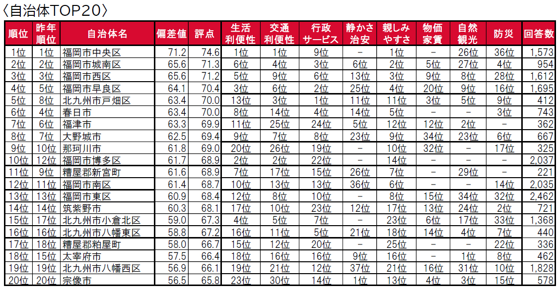 また、「北九州市小倉北区」は15位、「北九州市八幡東区」は16位、19位には「北九州市八幡西区」もランクインしています。