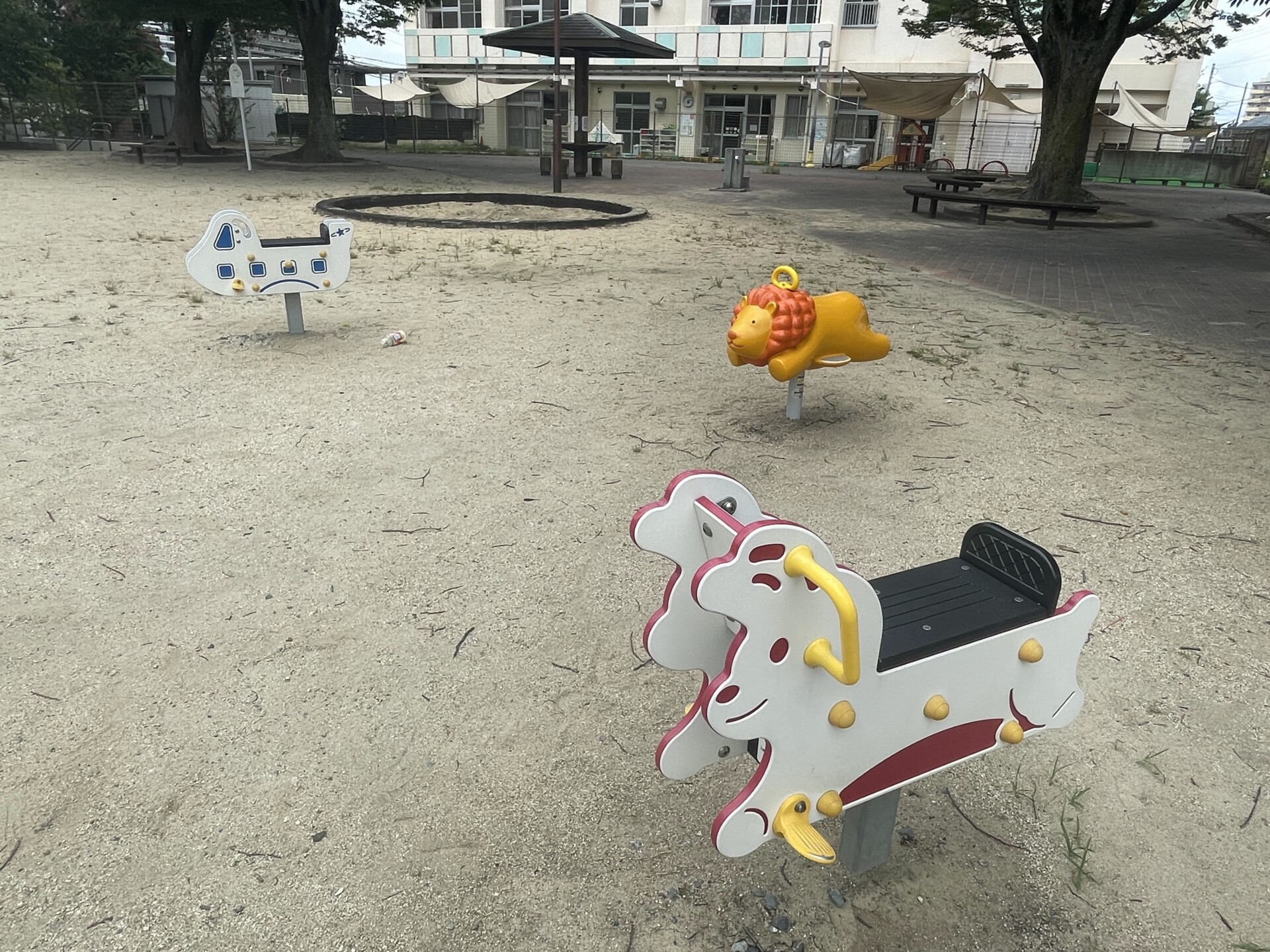 うさぎ、ライオン、飛行機のスウィング遊具や砂場もありました。ベンチや東屋、トイレもあるのでゆっくり休憩するのにいいですね。
