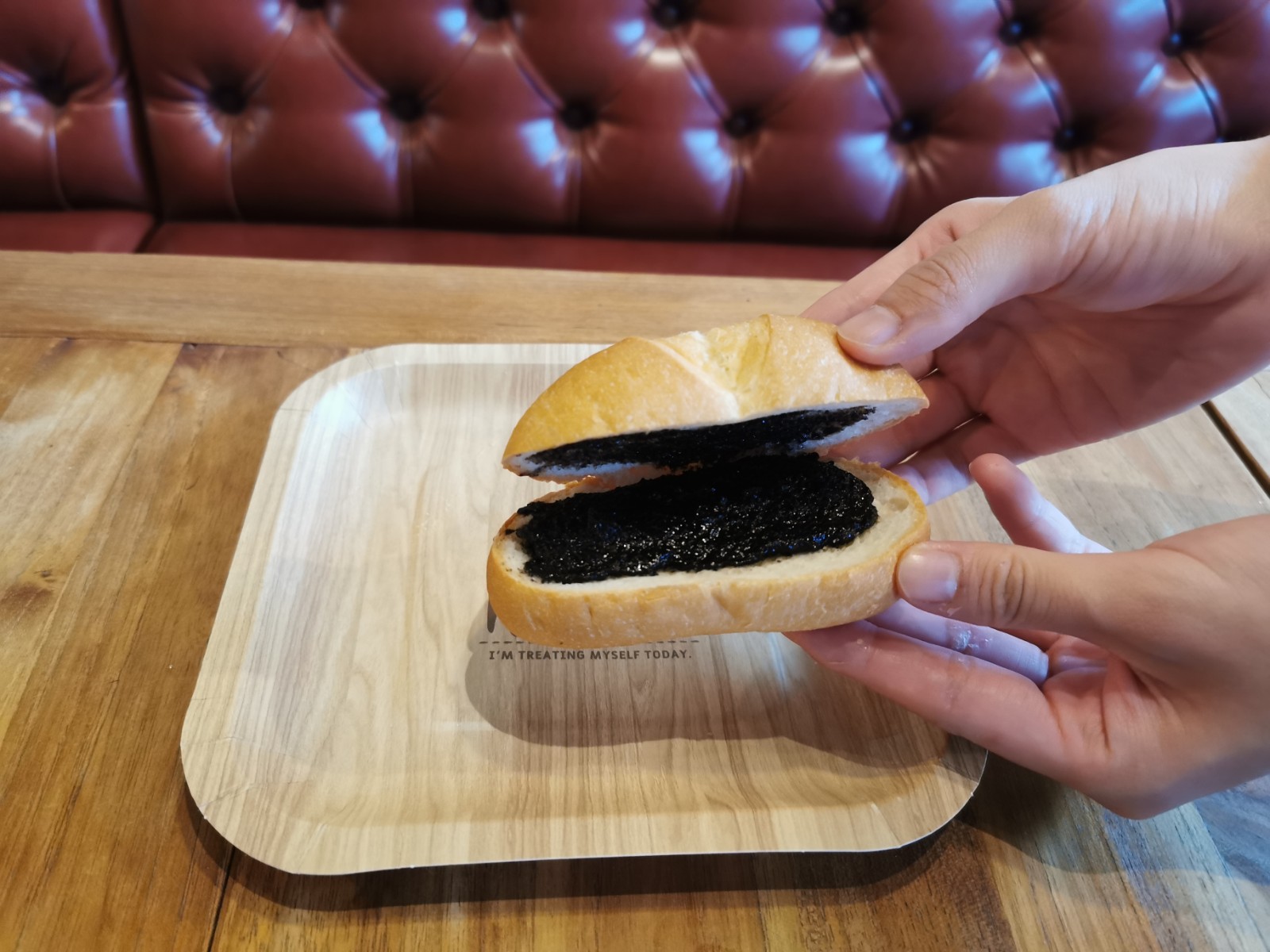 「黒ゴマフランス」(120円)は、ごま、黒糖、はちみつで作られた特製黒ゴマトーストを、ソフトフランスにたっぷりのせたもの。黒ゴマの食感がしっかりと残っていて、そのザクザク感と口の中広がるゴマの風味が美味しいです。