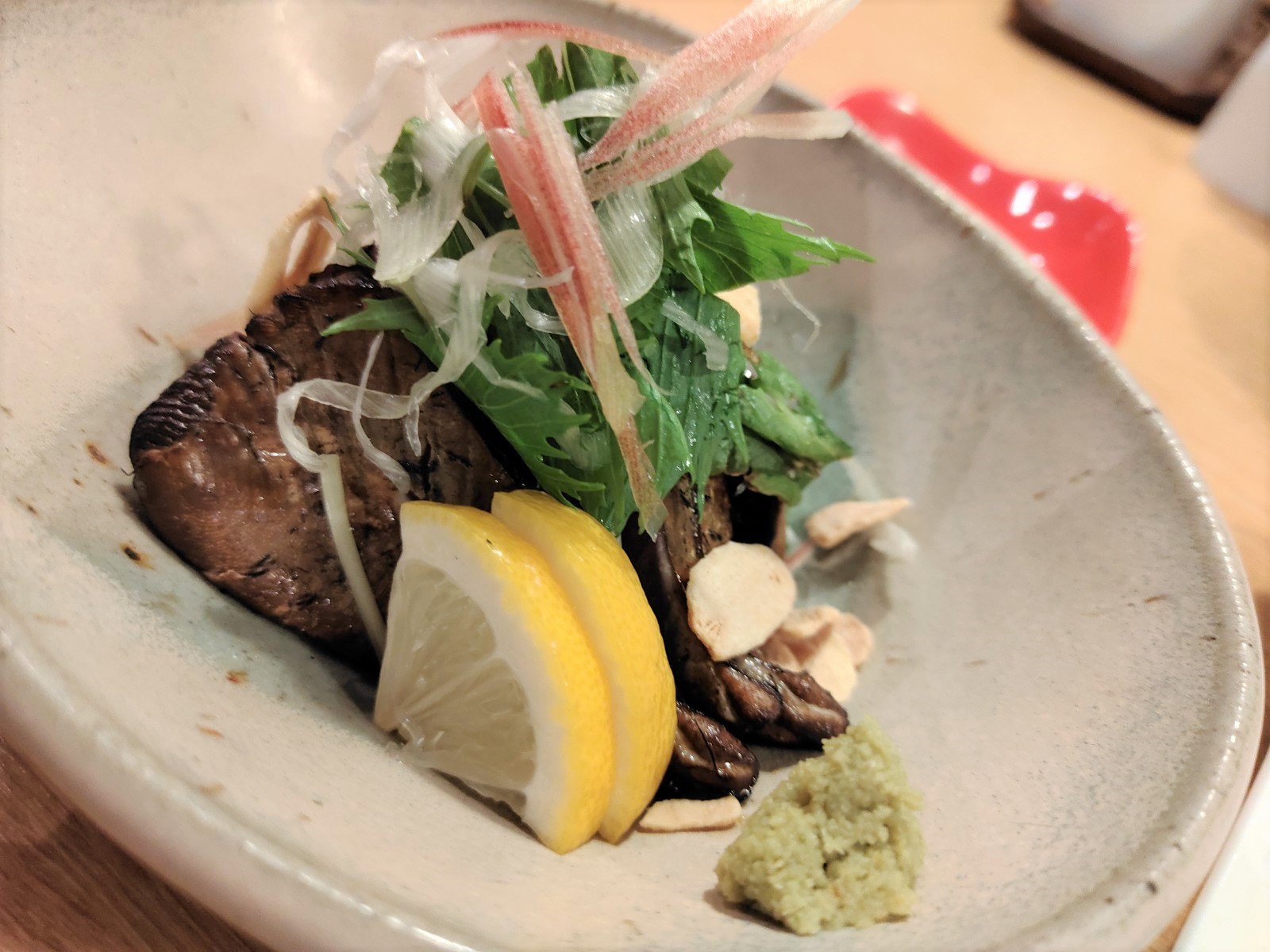 藁焼きは注文しなきゃここに来た意味がないくらいにオススメ。わさびと岩塩とにんにくで食べ進めますが、炙った薫りも美味しさのスパイスになっています。