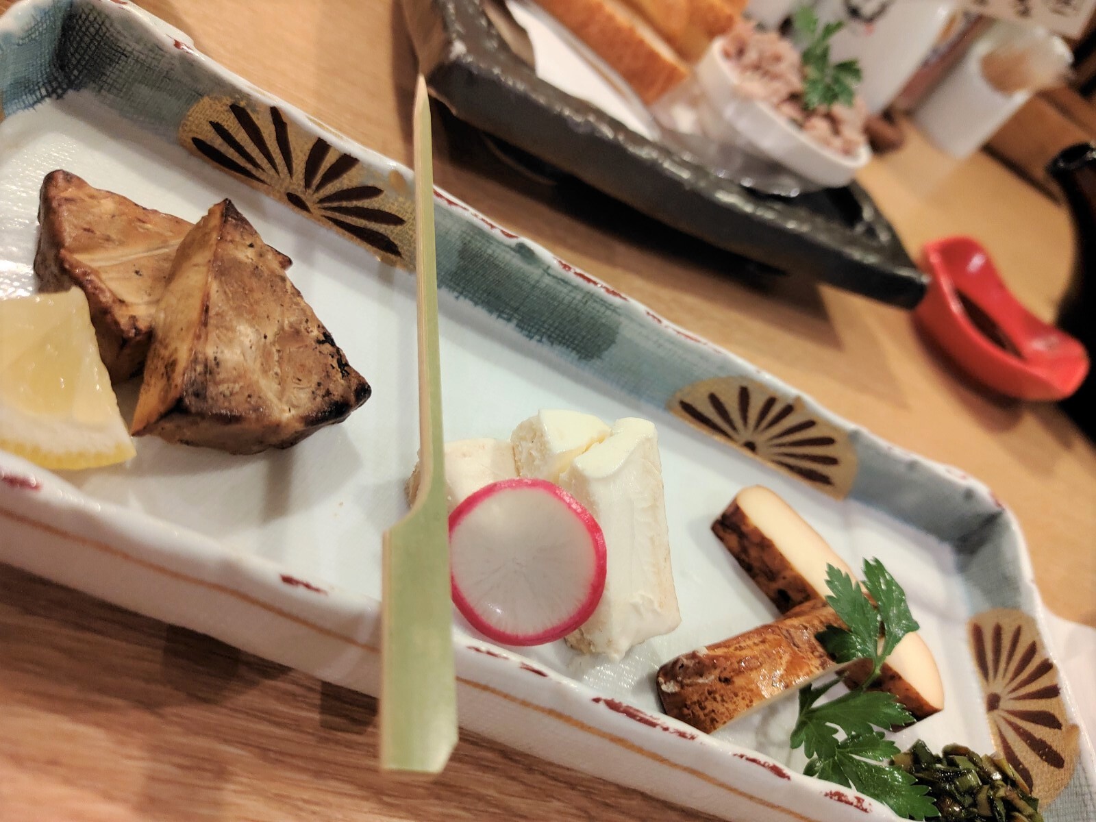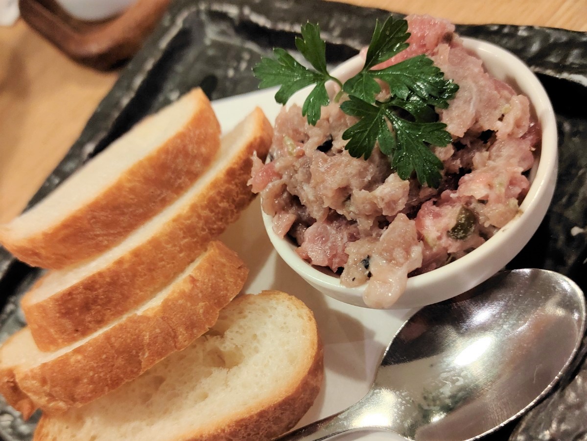 私が大好きな一品、マグロパテ。レバパテなどと違って爽やかな味がついた、粗みじんの身をバケットに乗せて味わいます。ワインや日本酒が恋しくなる味わい。今回は日本酒と合わせて楽しみました。