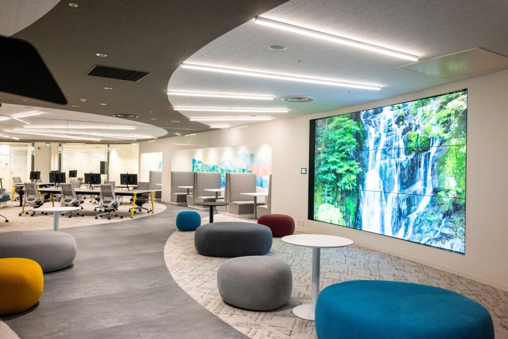 こちらはオフィスエリア。60インチのモニター9面で構成されたマルチモニターには、癒しの映像が流れており、石ころのようなソファーが置かれています。ちょっとした打ち合わせはもちろん、モニターを使ったプレゼンもできるようになっています。