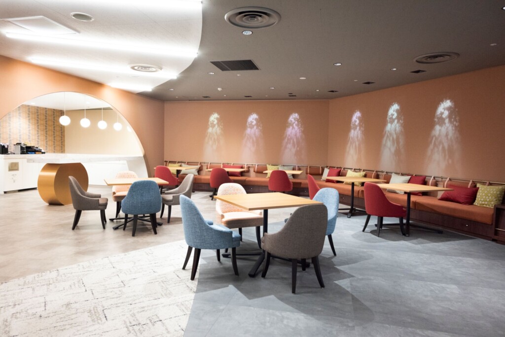 こちらはカフェテリア。壁には自然の情景を映し出すバイオシャドー(埋め込み型のプロジェクター)で、くつろぎの空間を演出しています。自由に利用できるコーヒーサーバーが設置され、リラックスタイムを過ごせるのはもちろん、机と椅子が可動式となっており、広い空間を利用した多目的スペースとしても活用できます。