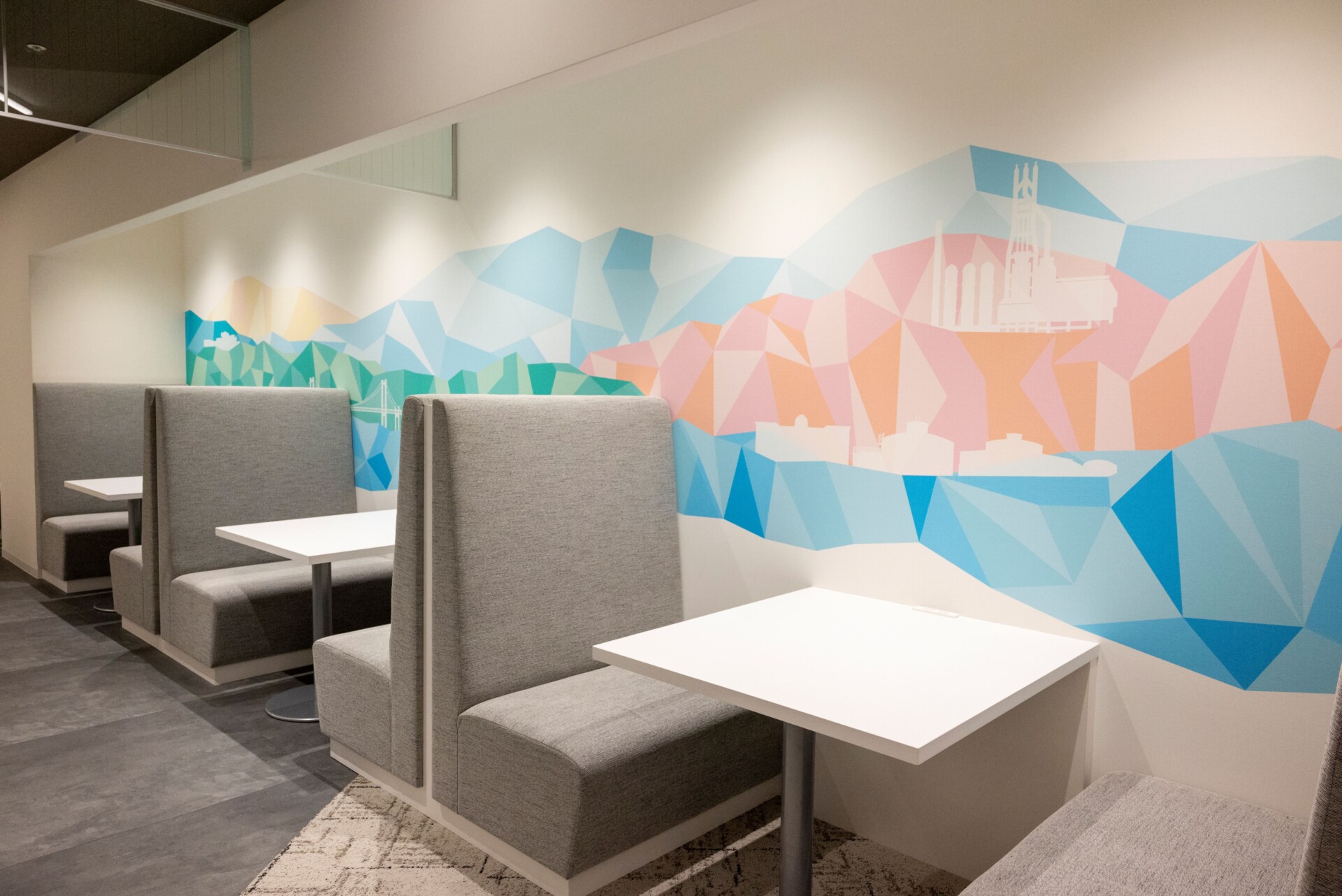 オフィスの壁には一面グラフィックアートが施されています。北九州市民に馴染みのある門司港駅や関門橋など、37カ所もの北九州の街のシンボルが描かれています。
