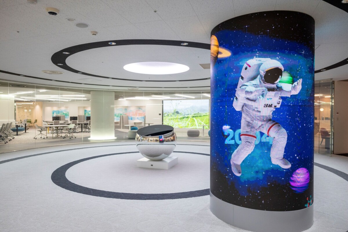 円形の広いエントランスには宇宙飛行士の映像が流れ、「何の会社?」と気になる人も多いかもしれません。こちらのオフィスに入居するのが、北九州に本社を構える化学系の専門商社「新ケミカル商事」。「NCT」はNew Chemical Tradingの頭文字を取ったロゴです。