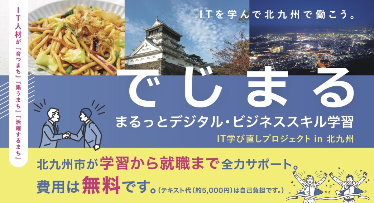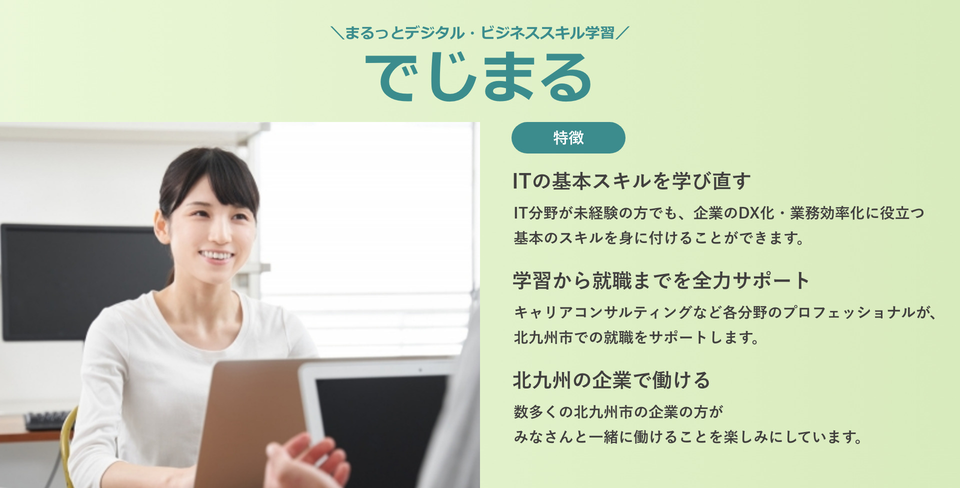 北九州市が主催する「でじまる」とは、「まるっとデジタル・ビジネススキル学習プログラム」のこと。企業のDX化・業務効率化に役立つスキルを学習し、市内企業への就職までサポートしてくれるプログラムとなっています。