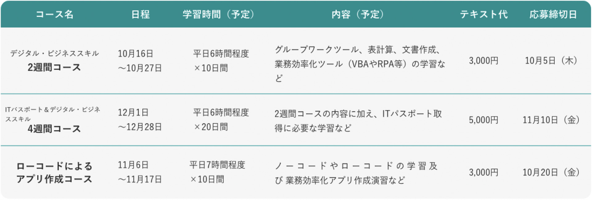 掲載しているカリキュラムは予定。各コース定員20人で、対面形式での受講です。