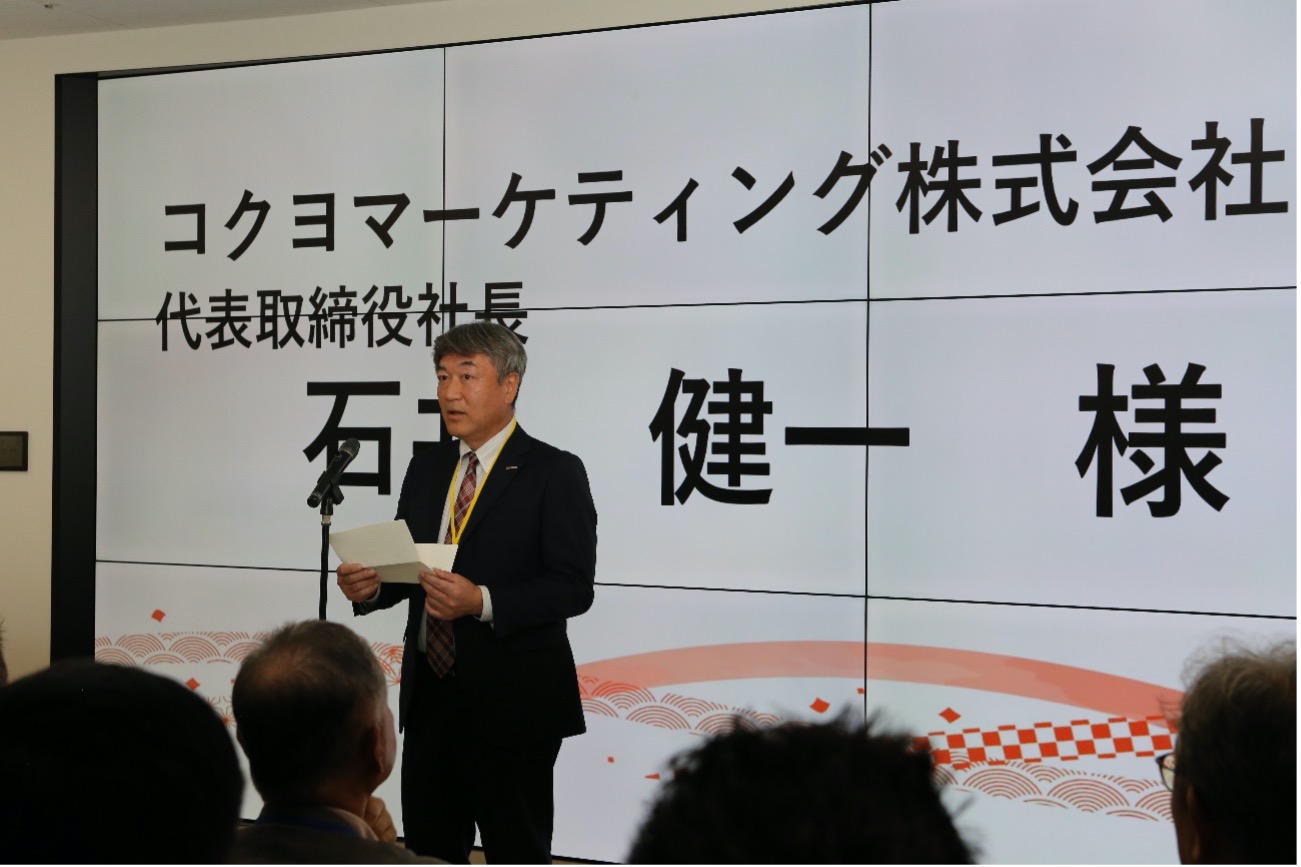お披露目会は油嶋武晴代表取締役社長のあいさつに続き、来賓代表として武内和久北九州市長、コクヨマーケティング株式会社の石井健一代表取締役社長が祝辞を述べました。