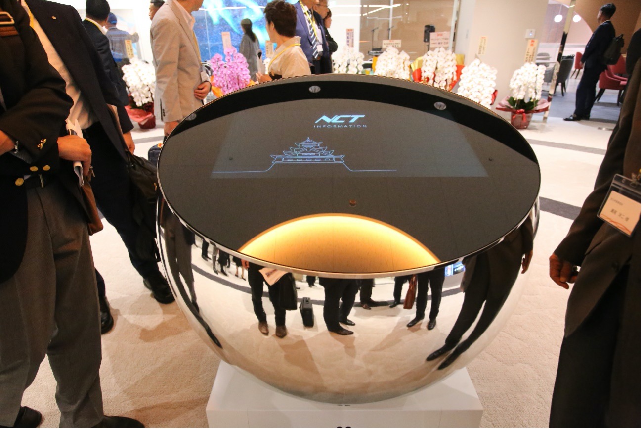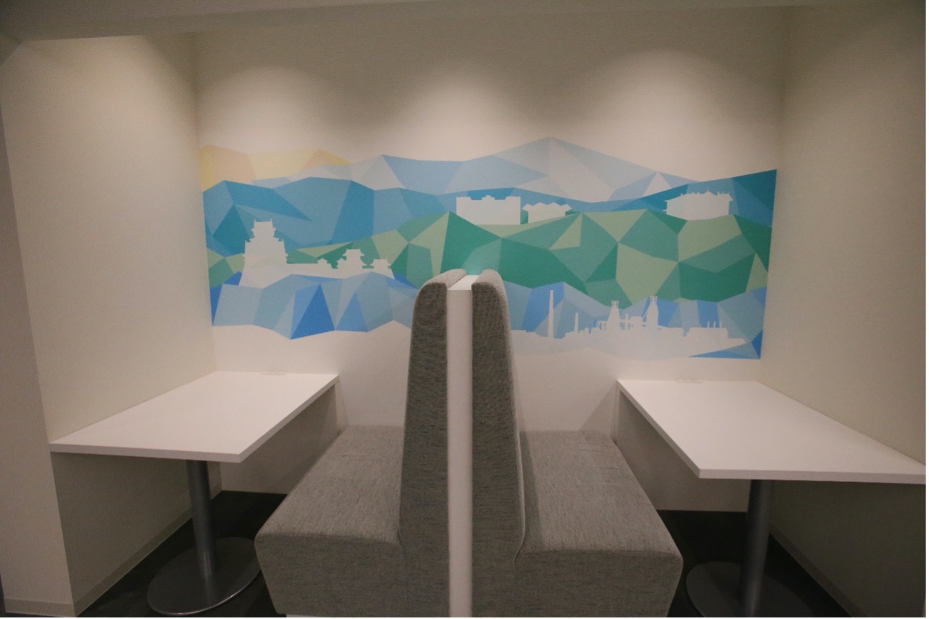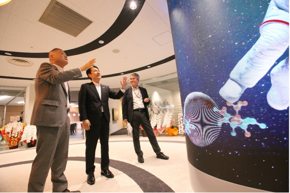 新オフィスは「魅せる」をコンセプトに、円形ガラス張りのエントランスや円柱デジタルサイネージといった近未来的な空間を作り出す一方で、壁面には北九州市のランドマークのグラフィックアートがデザインされるなど、地域密着性を持たせたオフィス空間も作り出しています。