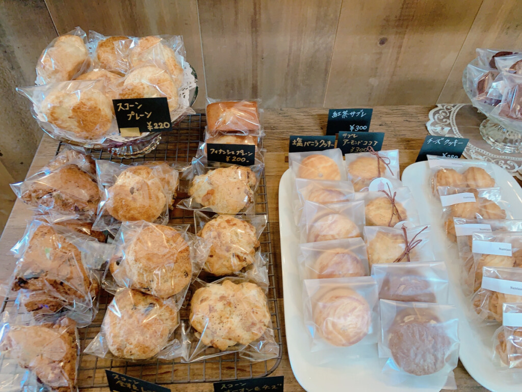 「幼い頃、母が焼いてくれたマドレーヌが原点」という同店のお菓子はシンプルでベーシック。訪問日はスコーンが4種類で、プレーン、全粒粉レーズン、オニオンチーズ、ルアムミットがありました。