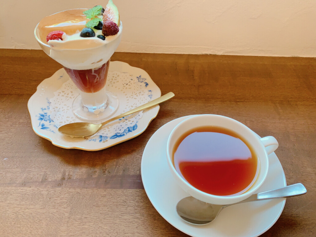 訪問時は立秋を過ぎたといえど、夏の暑さの残る日8月下旬。まずは、冷たいものをと、店主のきまぐれで作っているという季節のデザート「紅茶のゼリーとカスタードプリンのパフェ」をいただきました。