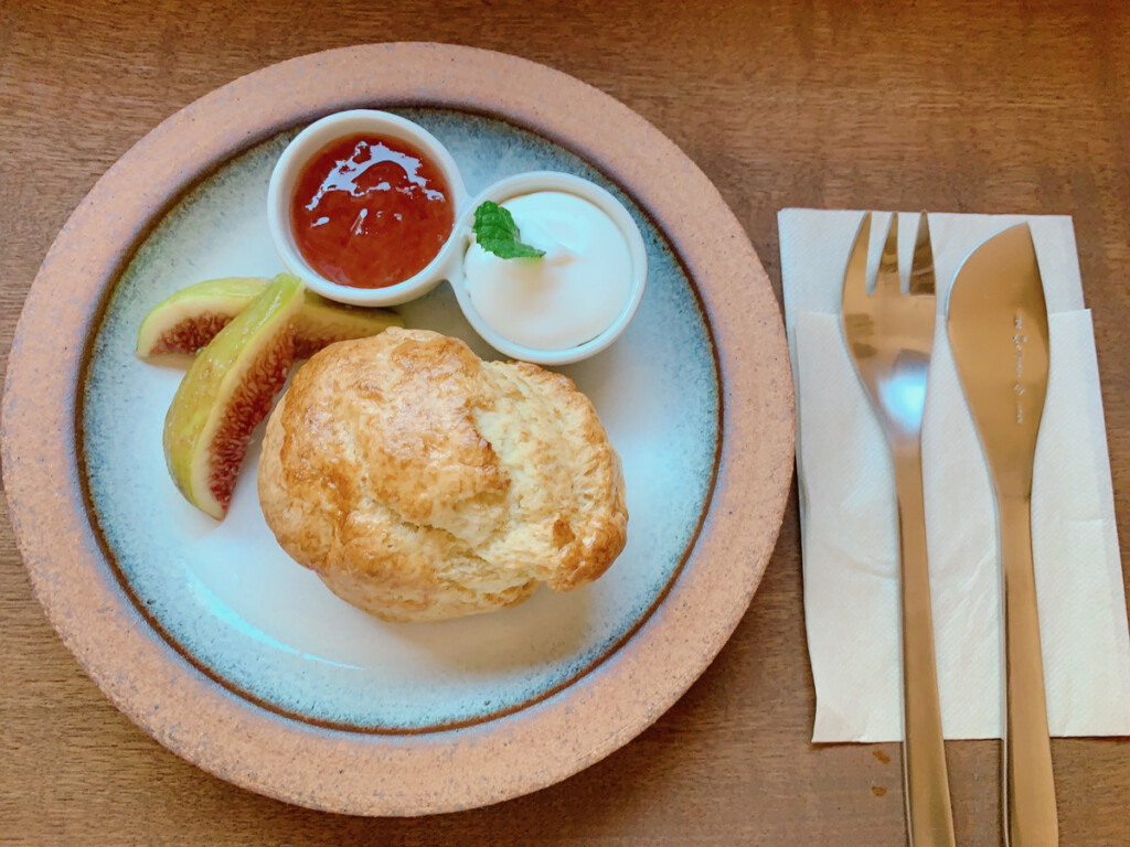 ひんやり冷たいデザートをいただいた後は、本命の「スコーン」を。同店のスコーンは、表面はつるんとしていて、一見目のつまったかっちり系のスコーンかな?と思いましたが、食べてみると中はふわふわ、バターの風味がほのかに香る優しいスコーン。庭で収穫したいちじくのジャムとクリームが添えられていました。