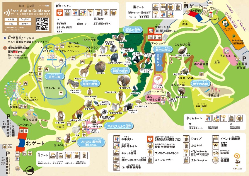 (到津の森公園-園内マップ2023)園内は大きく分けて、動物たちがいるゾーンと、遊具や広場などがある園地ゾーンに分かれています。入り口を抜けて園内に入ったらまずは園内の案内パンフレットを手に入れて、お目当ての場所をチェックしておきましょう(ホームページでも確認できるので、事前にチェックするのもOK)。