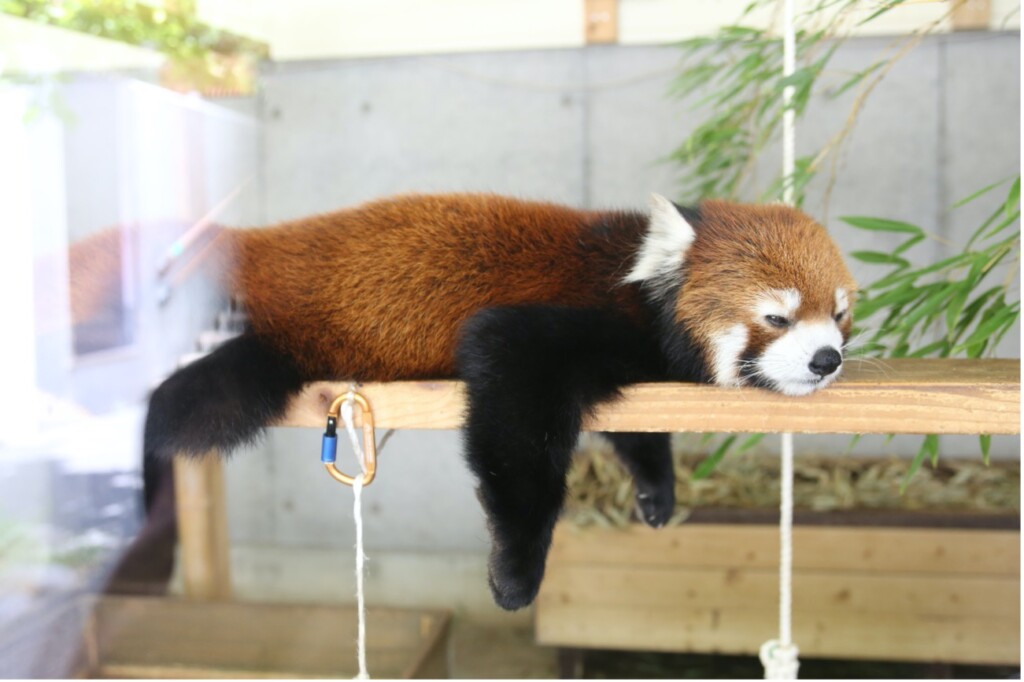 (レッサーパンダ)愛くるしさいっぱいなのがレッサーパンダ。運動できる広い環境で動いている姿を見ることもできますが、お昼寝中の姿も心が癒されます。鋭い爪を持っていて、木登りが得意なのだそう。