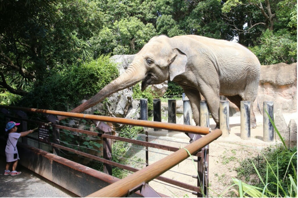 (ゾウへのエサやり体験)大きくて力持ち、セイロンゾウは園内の人気者です。エサやり体験は1日2回、決められた時間で体験できます(エサの販売は各回160個、なくなり次第終了)。小さなお子さんにはエサやりお助け棒が役立ちます。鼻先で上手にエサを口に運びますが、力が強いのでお助け棒はしっかり握ってくださいね。