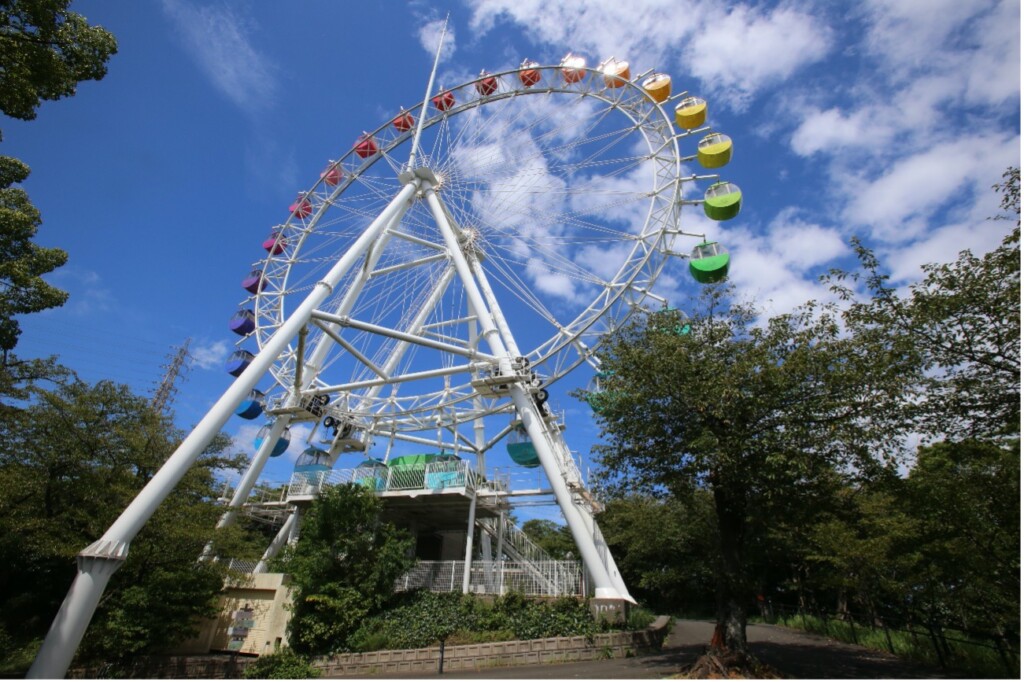 (芝生広場横にある観覧車)芝生広場から少し坂道を登ると滑り台など遊具が並ぶ子ども広場があり、そこは園内を一望できる観覧車まで揃うエリア。お子さんの気分転換にもなりますし、大人も思わず童心に戻ってしまいます。