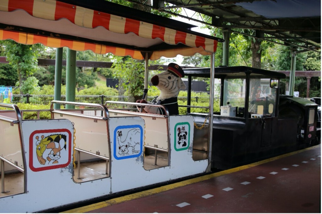 (こども汽車)プレイランドにある「こども汽車」。車掌はなんとシマウマのぬいぐるみ! 遊び心あふれていますね。ほかの乗り物にも動物のぬいぐるみたちが乗り込んでいますよ。見つけたら一緒に写真を撮っちゃいましょう。