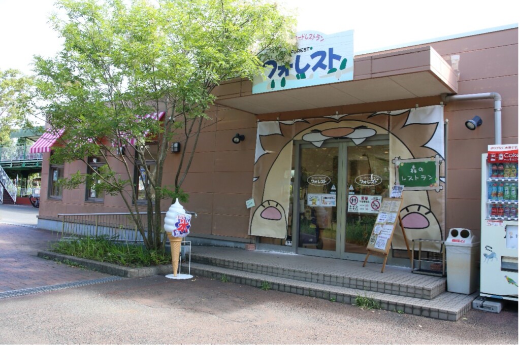 (レストラン「フォレスト」)ライオンとキリンを見て進んでいくと、プレイランド手前にレストラン「フォレスト」があります。人気メニューは「レッサーパンダ『クスクス』のお子様カレー」。