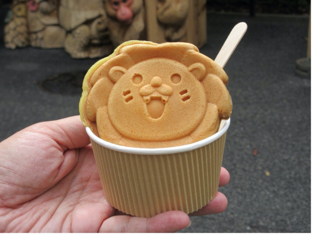 (らいおんソフト)南ゲート近くのズーショップ(管理センター内)で注目なのは、たい焼きならぬ「らいおんくん焼き」。中身は、あんこorカスタードで、中身までもっちり、冷めてもおいしい一品です。見た目もかわいさ満点で、食べるのが忍びないほど。