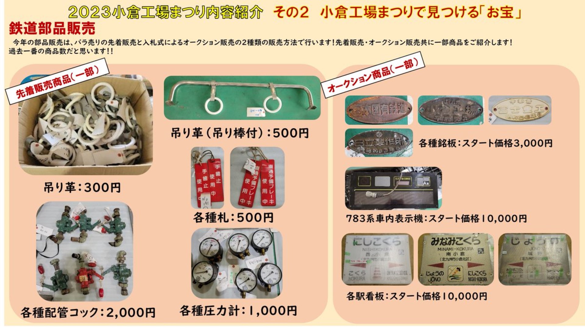 物販では、列車の座席生地を使ったオリジナルグッズや普段手に入らない鉄道部品などが販売されます。オークションも開かれ、駅の看板や銘板などレアなアイテムが出品されるようです。