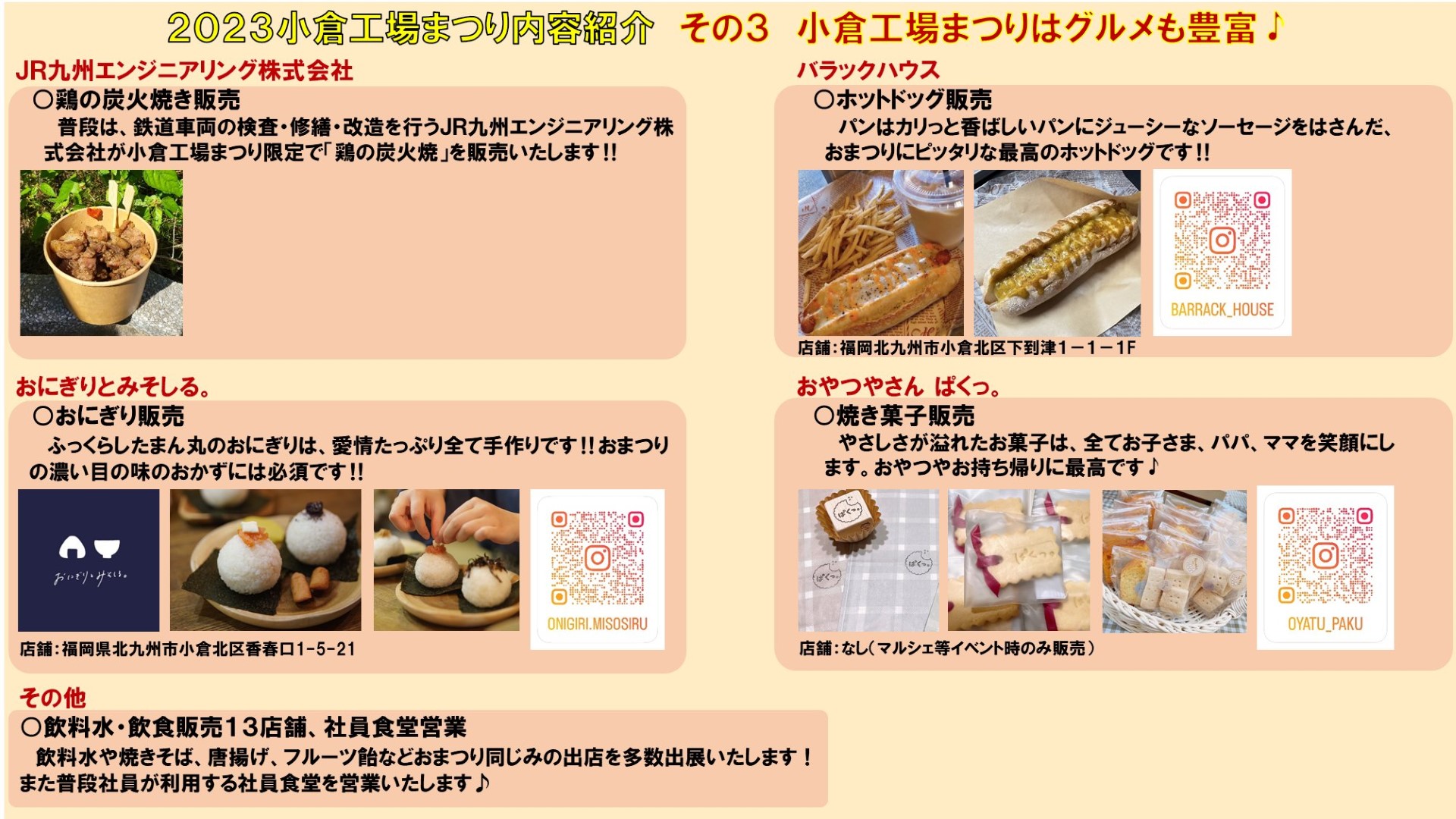 グルメ関係では、JR九州エンジニアリング株式会社のスタッフが振る舞う鶏の炭火焼などを用意。ほかにも、おにぎりやホットドック、スイーツ、ドリンクなど様々なお店が並びます。また、普段社員が利用している社員食堂も営業するようです。